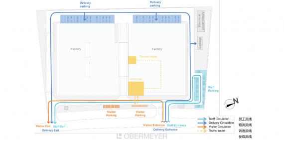 In terms of spatial layout, the project makes the most of the available land. The two three-story main factory buildings to the north and south are connected by an aerial corridor. Patios have been designed to improve the indoor lighting. The flow of cargo is concentrated on the west side, while the flow of tourists is concentrated on the east side. Auxiliary rooms and equipment are centered on the north side, optimizing both production efficiency and space utilization.