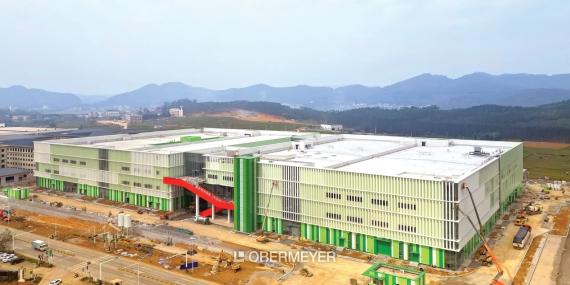 OBERMEYER’s design is guided by the core concept of "compact efficiency and natural harmony", integrating the factory buildings seamlessly with the jasmine fields in Hengzhou. The architectural style is simple and solemn. The facades are mainly made of aluminum panels and glass curtain walls, which emphasize the horizontal extension. The light green colour scheme blends perfectly with the surrounding natural environment. The auxiliary buildings have the same design elements and colour scheme as the main factory buildings, creating a high level of visual unity throughout the park.