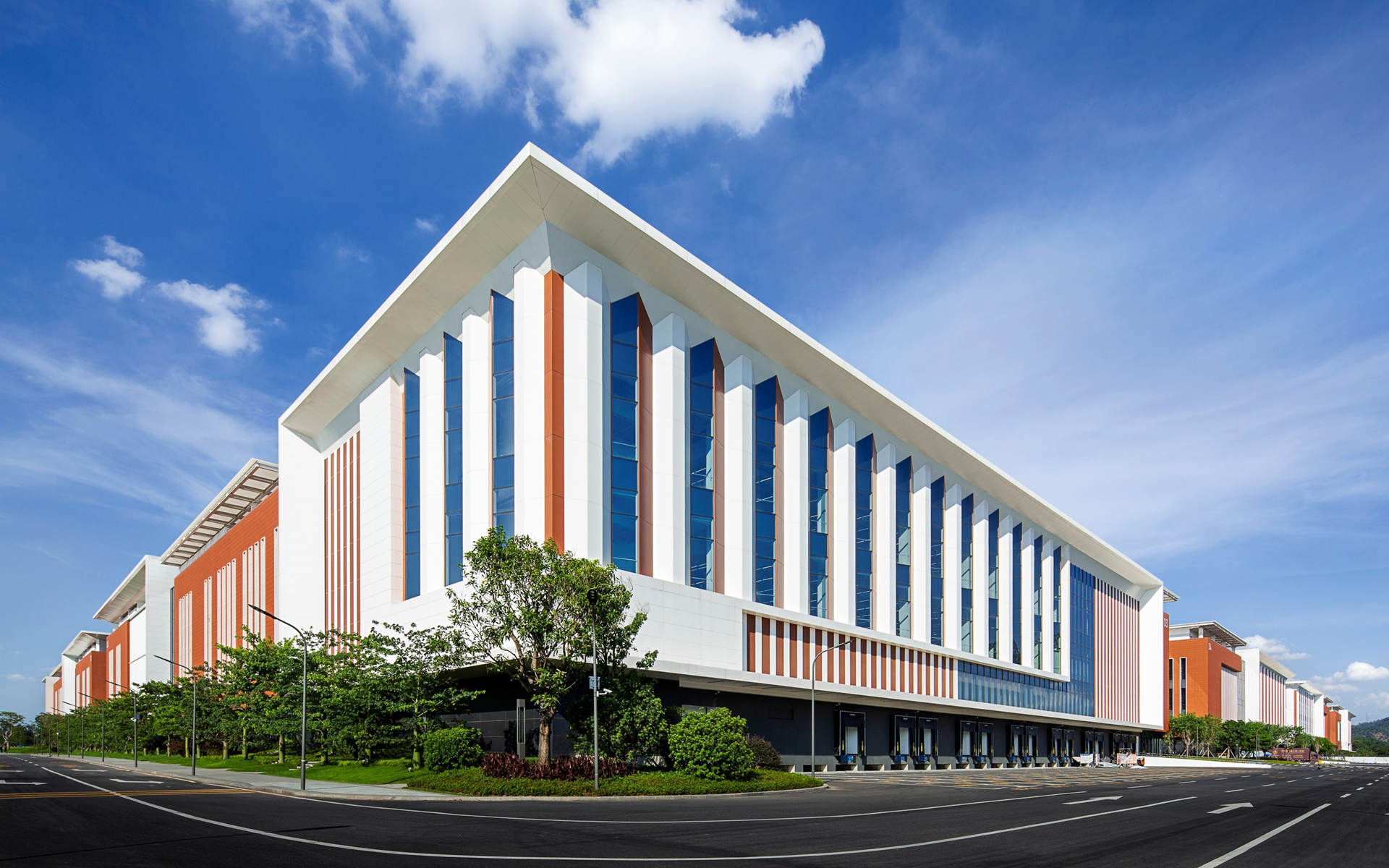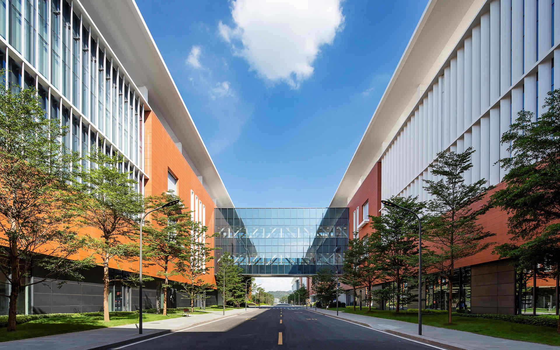 高度细致的立面遵循”功能追随形式”原则,同时又避免设计成人们固有观念里工业园区厂房如一个个“集装箱式的功能盒子”。根据对核心功能的考虑,立面的设计方法分为封闭、半开放和开放立面。欧博迈亚考虑厂房较大的空间尺度,从设计手法而言,更加重视节奏和细节的比例,让园区有较好的近人尺度。同时,外立面整体配色方案都是明快而温暖的,同时也呼应了南方的生活方式。