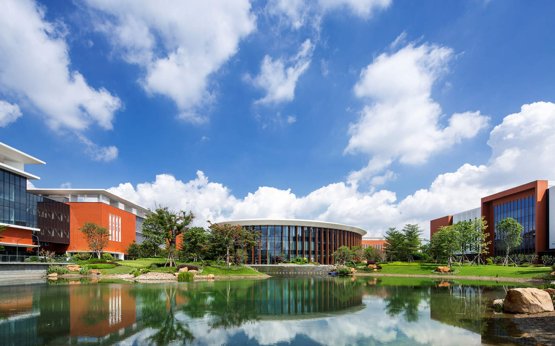 园区总体规划基于功能及流线组织的逻辑关系,提供高品质的室外空间。此外,欧博迈亚设计团队通过与华为项目团队通力协作,采用中央绿地和走廊将工厂和餐厅整合为一个有机整体。中央绿地公园将作为核心区域服务于各个厂房共同组成的整体园区。具有标志性和舒适性的餐厅,班车和丰富的景观设施会给这一区域带来多样性的活力。欧博迈亚通过践行高科技生产园区的核心理念,赋予八号地块不同于传统电子工厂的空间体验。
